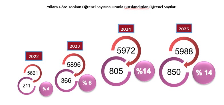 - 2025-26 Akademik Yılında ise, ilgili burs süreci Ekimin son haftası itibarıyla tamamlanmış ve kurum dağılımlı listelerin ön değerlendirme sonuçları neticesinde İYTE Rektörlüğü EBU Koordinatörlüğü aracılığı ile 513 ve İYTE VAKFI Burslarından 129 ihtiyaç/Başarı ölçeğinde ve 208 yemek ölçeğinde: toplam 850 İYTE Öğrencisine burs sağlanabilmiştir.
