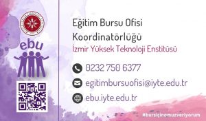 - Form gönderme işleminiz tamamlandığında, e-kartınız; size ve ilgili kişinin e-posta adresine egitimbursuofisi@iyte.edu.tr kurumsal hesabımızdan ve en geç 3 iş günü içerisinde gönderilecektir.